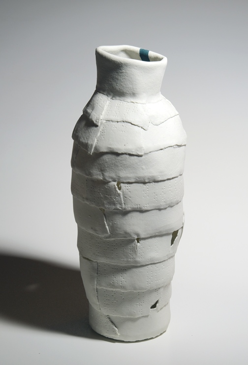 Braille is als een geheimschrift voor de goede verstaander. Welk verhaal vertelt deze vaas door de braille in de huid, door de gaten in de romp, door het spel van licht en donker? Als de functie van bloemdrager wegvalt door gaten en scheuren, ontstaat er ruimte om verder te kijken, om de vaas als waardevol in zichzelf te waarderen. Nieuw Andere functies krijgen meer aandacht, die van verhalenverteller, drager van schoonheid en betekenis. De rafelrandjes worden niet meer weggemoffeld, maar krijgen een ereplaats